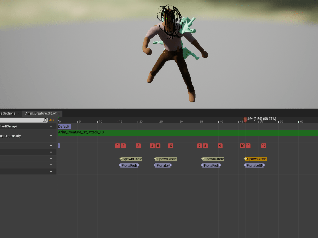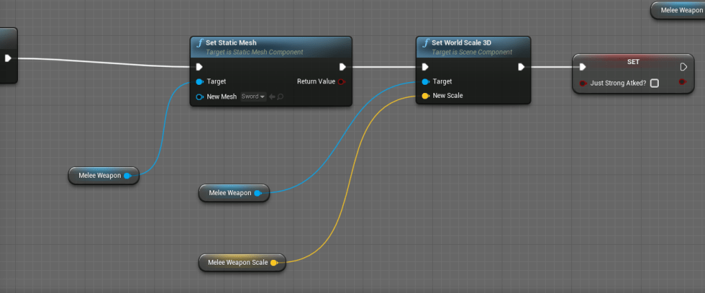 I made sure both bosses reacted to each other’s deaths appropriately. This way it has an effect to how the fight will work. While testing the combat I noticed how buggy the hammer attack was. I forgot that the scale of the weapon I used was incredibly different and the collision of the weapon was tied to the model so it would basically just have all the wrong sizes. To fix this I separated the weapon collision from the weapon itself so it doesn’t change when the weapons changes.
