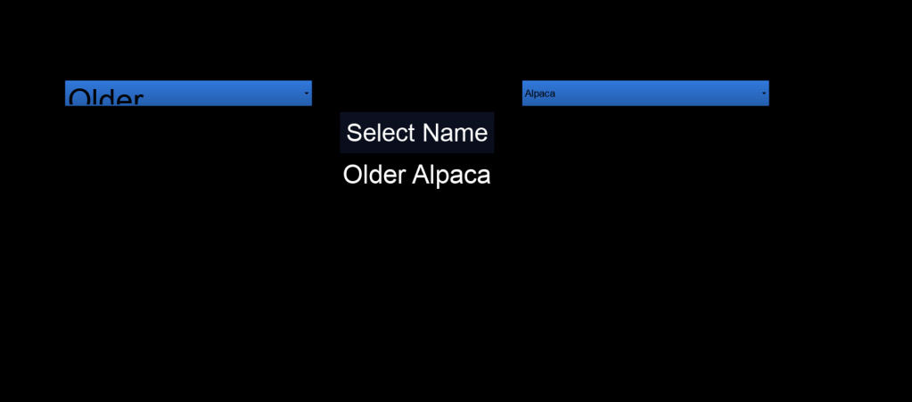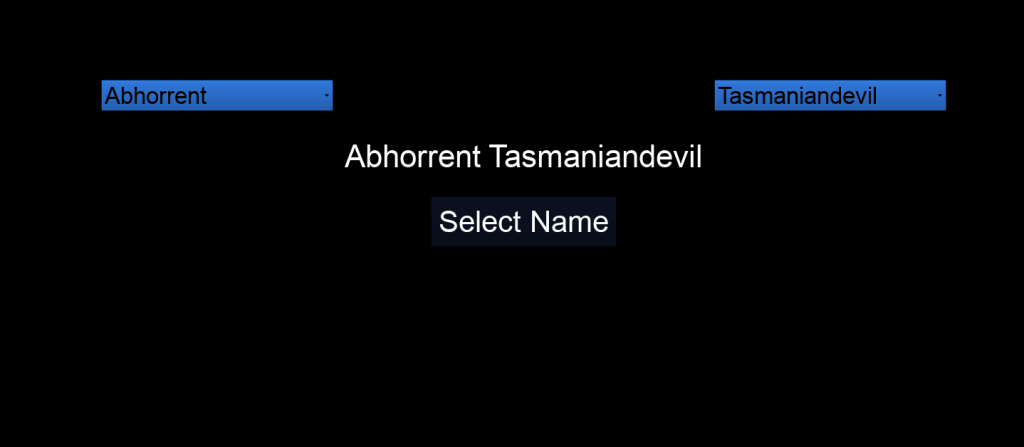 I fixed the look of the dropdown box for the names, they used to change sizes because I had them in the wrong box that would adjust strangely based on the font size within. After I removed it from the boxes I was able to change the font size freely and without issue. I also rearranged it so the selection looks nicer. Since the name doesn’t appear anywhere else but the save file I also added it to the journal. I still have to think where else I can use the name, but it’s not really that important, it is just a cool and fun thing to pick for your character that is of no consequence.