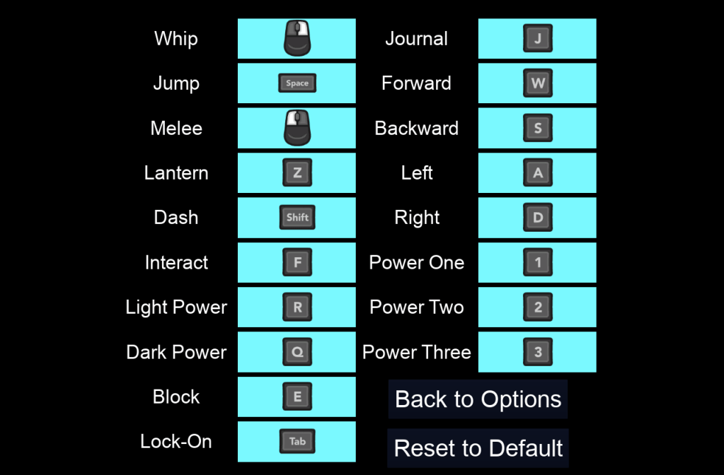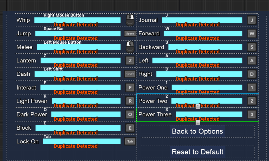I then moved to something I have also been putting off for awhile, the appearance of the input options. It didn’t look nice that it had long bars that had the key name inside, especially for the gamepad because it had the literal key name such as ‘Gamepad face button top.’ The solution that I found worked best was to make the text invisible within the input selector and then place the key image inside the box. I made sure the image didn’t block any selection because at first it was blocking the navigation. It looks a like nicer and I changed it from the teal color which was not very pleasing to the eyes.