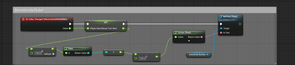 I then added data to the player’s file that will contain the sensitivity for both the mouse and the gamepad. Settings for sensitivity is very important as well. Not sure what the max should be set to so I set it to 5 or now. It wasn’t too hard but I did have to create a new functions to save the player’s data. For the sensitivity slider for the mouse it went down all the way to the third decimal place and I didn’t like how it looked so I looked online for some help and there was some simple math to fix it. It worked nicely and created float values that only went down to the second decimal.