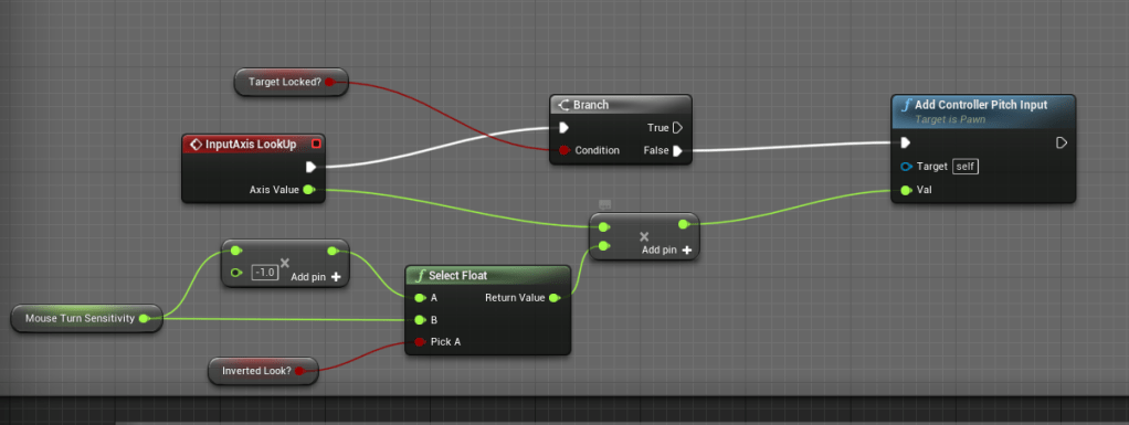 I tied it to the pitch of the camera, so it can specifically tell if the player is looking up. I also made sure to clamp the angle at which the player can look up, so they can’t look too far up. Now the camera moves to the right so the player can see around the character. It is a very helpful change so the character will get in the way less.