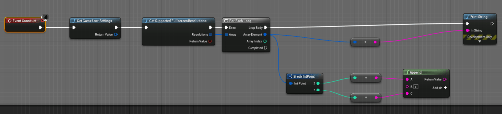 I’m basically creating a string for all the resolutions and putting an ‘x’ in between so it is clear that it is a resolution. To turn it back and set it as a resolution I learned to split a string and convert it into an IntPoint. The great thing about all the video settings is that it is part of the engine already so it already has its own functions for saving, loading, and applying. All I need to worry about is how to set it up for the player to be able to choose what they want. I also need to learn how the benchmarking works. There seems to be a function that can set the settings to the recommended values based on the player’s hardware. I think that will be extremely helpful for some people.