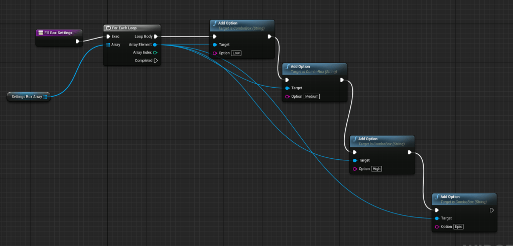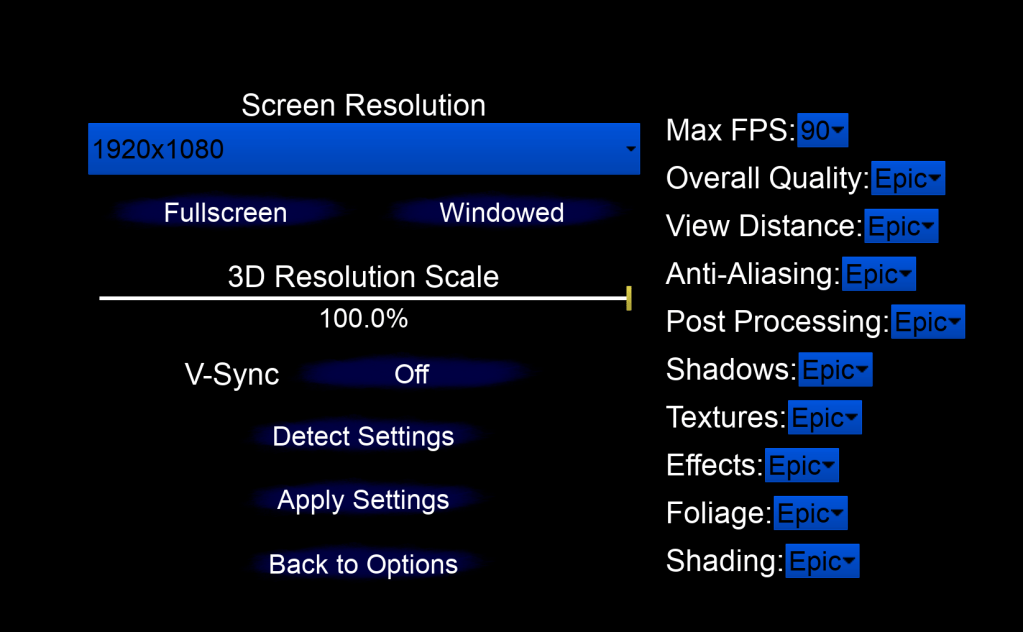 The settings of Shadows, Foliage, Anti-aliasing, and 3D resolution scale, are the ones I believe will make the biggest change in performance for my game. With all of the setting buttons plugged in I also learned about the benchmark function that can try to detect the best settings of the player’s hardware. Using this I can set the quality of the settings based on what the engine thinks is best. Hopefully this isn’t an outdated function and will be helpful for those who have low-end computers. I want my game to be accessible to many people, and being able to run it is definitely the first thing that is required.