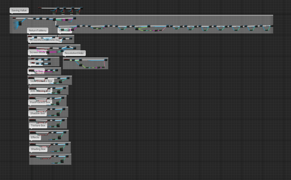 It became a large blueprint but I have seen some other people’s works that are much more complex and humungous. I just hope that there isn’t an issue with mine that could potentially crash the game due to the settings. But I did watch a lot of WTF and HTF videos today on most of the settings. Some of them won’t make a huge difference in the game. For the view distance, an object must have a view distance set in its variables for the setting to actually work. I wasn’t aware this was a thing and haven’t set any view distance for any objects. But at the moment it doesn’t seem relevant as I don’t have a crazy amount of objects presented on the screen at any given moment.