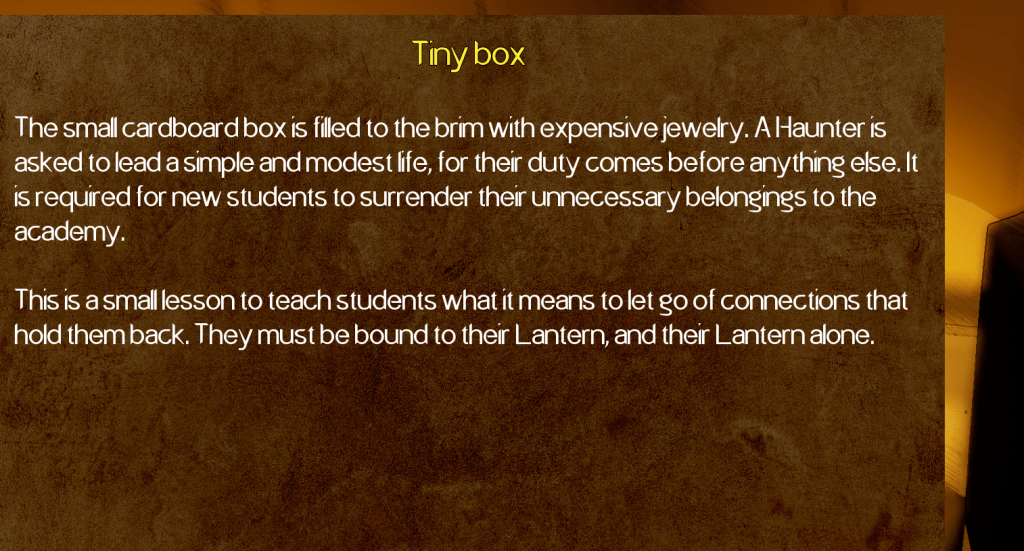 To begin the changes I started trying to find a new font. I had to import them into the game and replace the default font I had so I could see how it looked like within the context of the world and gameplay. I tested a few fonts before I landed on one I really liked. My decision was also informed by the fact that I couldn’t find a reliable way to change the font for all the texts, so I believe I found a font that is both pleasing to look at and easy enough to comprehend.