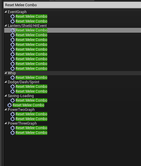For awhile now I have been thinking about a way to fix the logic of my melee attack. Since it works in a way that it has to be reset if it is interrupted, I had a macro that I attached to everything that could potentially interrupt it. This wasn’t a good system, if I forget to add it then the melee never works. And every time I added a new action I had to make sure it worked to reset the melee. I checked how many I had and they were all over the place. In order to make it more efficient and easier for myself in the future I decided I needed to stop relying on the resets and reset it within the melee attack itself somehow. So I first worked on removing all the macros from the blueprint, which helped clear up some space. Then I started experimenting with ways I could reset the melee combo without issues.