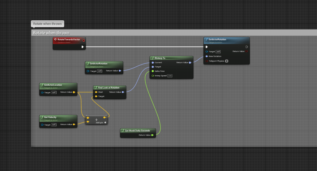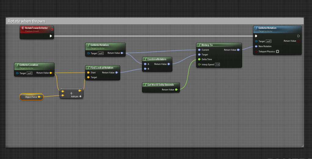 It was actually a good thing I watched the video on math of Unreal engine because I dealt with vectors in trying to fix how objects are thrown. They are properly flung but they remain to static when in the air, there is no spin or change in rotation of the object. It looked strange simply flying in the air motionless. So I searched for help and found a solution to interpolate the object’s current rotation to the rotation of the vector it is pointed at. A vector is a direction with a length after all, at least that’s what I can recall, maybe I am wrong. Anyway it worked great, it would turn towards the direction it is being pulled. But it still didn’t turn enough for my liking. So, I kept trying different ways of adding, multiplying, and scaling the rotator of the target, but nothing worked.