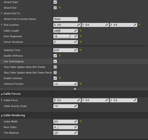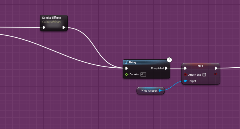 I also fixed the delay on the whip action, I changed the delay to a retriggerable delay because with a normal delay you can still spam the action. Then I wanted to greatly improve the appearance of the whip. It didn’t look great appearing and disappearing so fast. I started off by changing a lot of the whip’s properties, testing out which looked best. From the whip’s segments, to how stiff it is, its iterations. I changed and tested as much as I could until I found the proper numbers that I thought looked good.