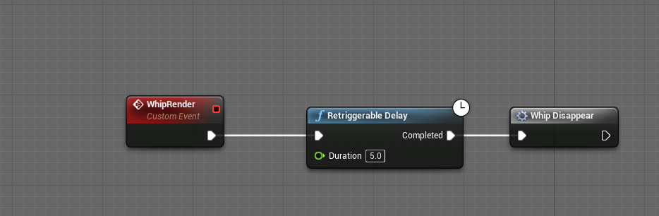 I realized I could make a separate event where the trigger of the whip’s disappear could be called again and again. Previously I had it attached at the end which is why it didn’t work well because the timing would overlap to when the whip was appearing. Essentially this works to always make sure the whip doesn’t disappear when it is being used.