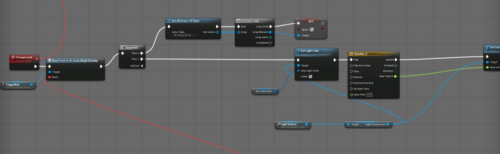 While testing the second level I found an issue with the boss trigger. I didn’t realize I was activating the trigger after a timeline finished. So if the player were to run straight for the door after they solved the puzzle the boss would not activate. I moved up the even to make sure the trigger was activated immediately as soon as the puzzle was solved.