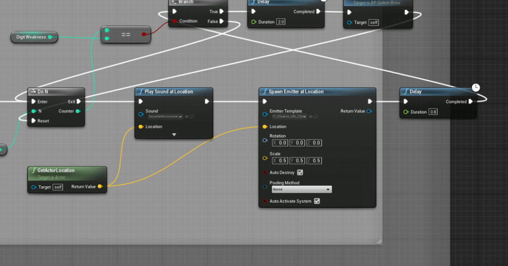 Clarity in games is very important to me. I need to remember that if I have an audio cue I should have a visual cue with it as well. There is a cue the golem boss has that was only sound, to make it clearer I added visual effects on top of it. There might be people who don’t play with sound at all, so it is important to be able to communicate important details in several ways. This cue was also able to overlap itself, so I made sure it didn’t happen anymore by adding a do once node that would reset when it was done playing.