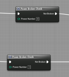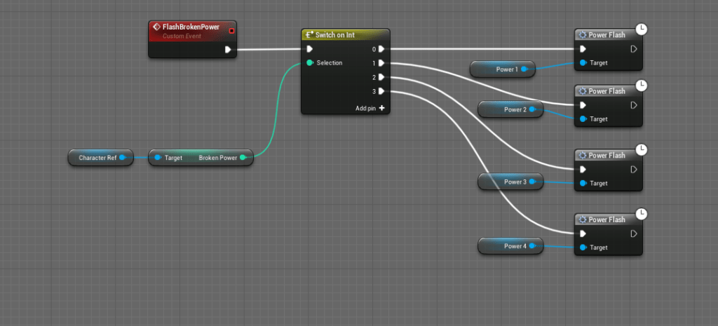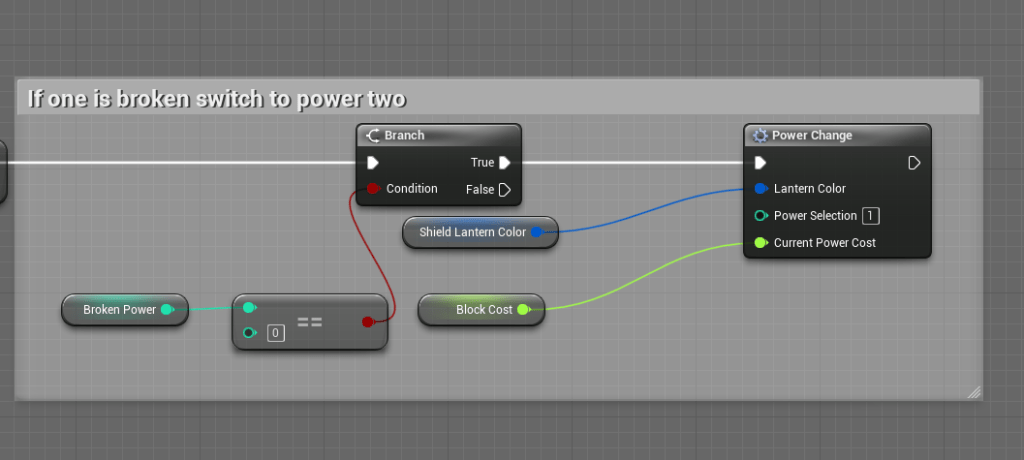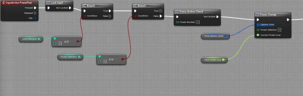 Now when switching a power the game will check if it is a broken power. The default integer of the broken power variable is at 69, so at the start nothing is broken. Since power one is the default power. I had to create a check that if it is the broken power it will set the selected power to two. I don’t have to do that for the other powers because it will always try to set itself to the first one.