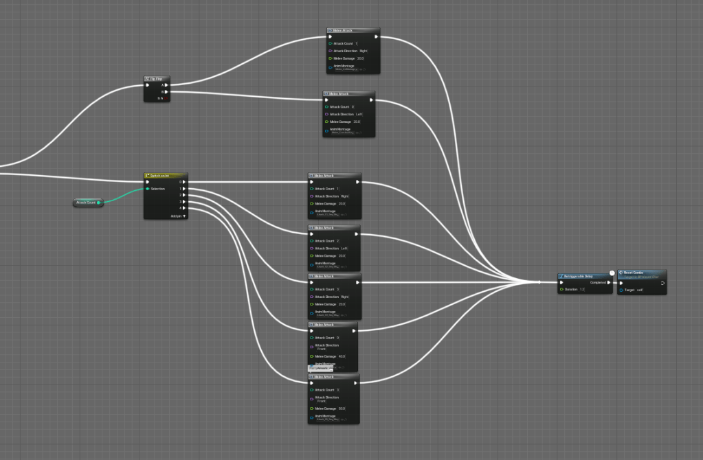 The player cannot sprint while whipping, and I had forgotten to do the same for the melee attack. So far with these changes the melee does feel a lot smoother and there is more variety. I was able to simplify how the melee flow looked as well. A separate branch for attacks in the air is much better than having them in the main branch.
