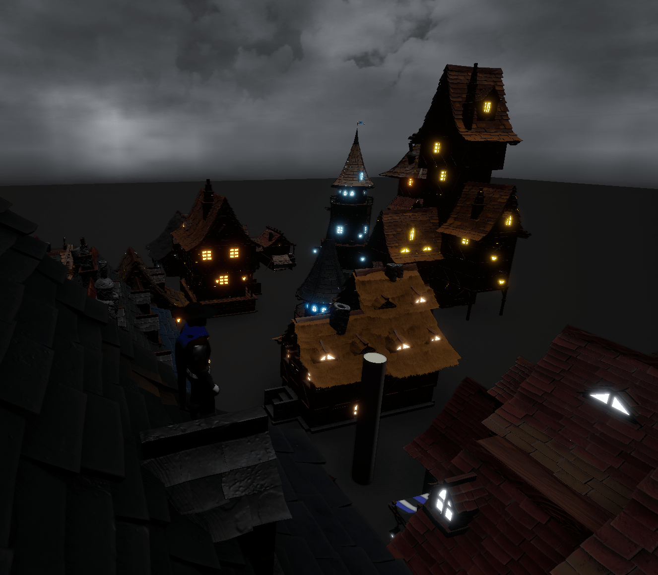 Then finally I started work on the fourth stage. It is mostly testing out how I want the sky to look, and getting the lighting right. I tested out some buildings from a free asset I got awhile back and I may use some of the buildings. The lights and different colored roofs are vibrant and colorful. This is a stage that won’t be hard to build hopefully. I just have to figure out a way to make it unique. I played a lot with the lighting to get the sky right and finally make it look pleasing. The values for the camera lens in the post-process, I had to tweak those a lot as well.