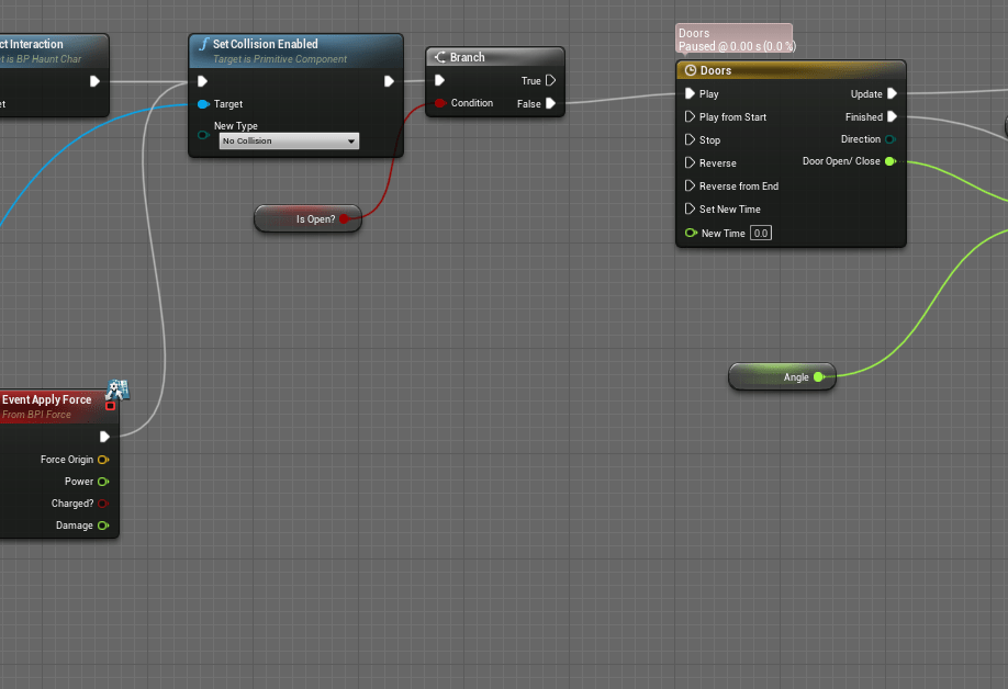 I wanted to give the whip more things to do, and that gave me the idea to use the force interface. By giving certain objects the interface I can make the whip easily interact with it. I added it to the doors and most of the other interactable objects in the first stage. I just had to rearrange some of the functions so it doesn’t do the exact same thing if the player interacted with it normally. And with that it felt great being able to whip doors open and light torches as well.