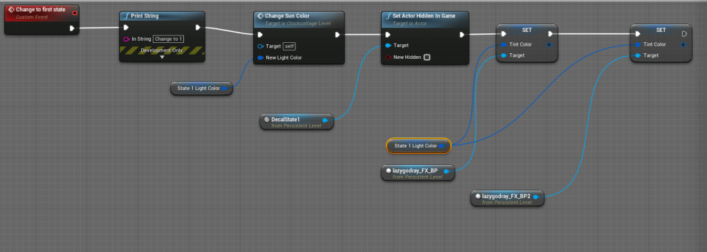 Started plugging in the different objects and actors I wanted to change per “time shift.” It will take some sharp eyes to find all the things that are new within the level. I hope players don’t get too annoyed by it. It took awhile for be to be able to change one of the skeletal meshes because the animation would apply to the mesh for some reason. I eventually found the solution by furiously testing different nodes.