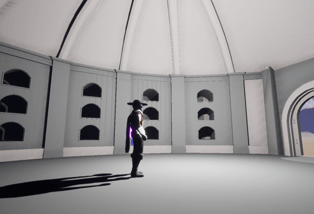 I was happy with the main puzzle, so I started work on one of the structures. It was the mausoleum that I pieced together with separate parts. Using the spline wall I was able to wrap around the outside because the mausoleum piece doesn’t come with its own boundary. It does come with great ceiling pieces I had to assemble as well. Once the walls and ceiling were in place I added a floor and then I put the lids on the slots in the walls. It was very dark inside so I created a reusable light that I decided I’m going to use all around the level for ease and consistence.