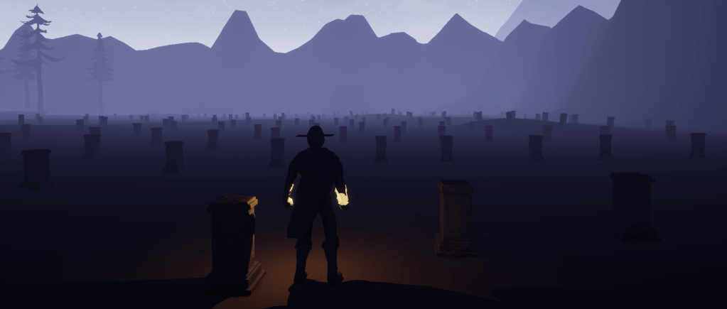 Finished up one section of the level. Probably won’t be adding anything to it unless I create a new interesting object. For the next part I tested out a few ways I wanted to fill it up. I eventually went with using the foliage tool to lay down the tombstones and flowers. Using varying colors of flowers it looked great in-game under the dim lighting. Not all the flowers glow which is intentional. Then I made sure to fill up more of the area. I arranged them deliberately, while the graves are a bit chaotic, but I’m okay with that.