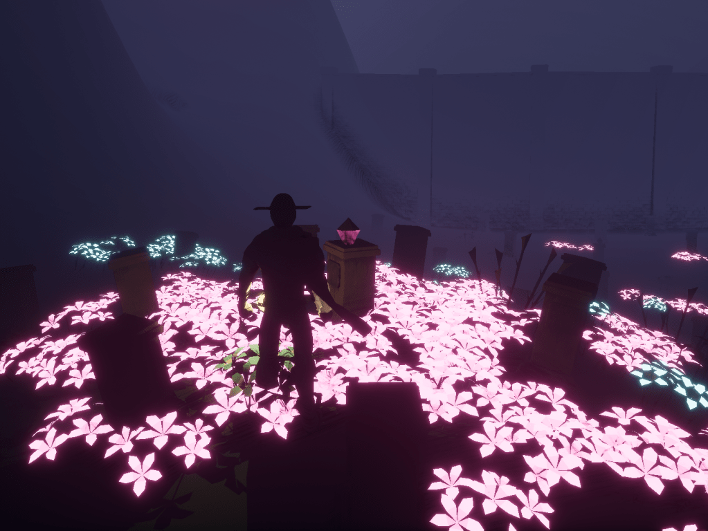 I placed some of the flowers from above so I could get a perspective that could see the entire field. I wanted it to look similar to a night sky filled with stars. One area in particular is more filled with glowing flowers for good reason. Altogether the area is in great progress. The buildings don’t feel out of place next to the graveyard. The final building will be the most complicated, so I’ll start making it once I’m done with this flower section.
