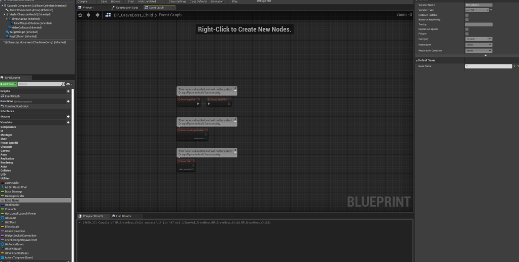 I tested out different sizes for the boss room and I wanted somehow long and quite narrow. I may change it going forward. My idea for this fight is for it to feel a bit too tight similar to the third level. The glass material adds nice visuals. Boss walked fine on the nav mesh. Instead of copy-pasting the blueprint of the boss, I made a child instead. The child should only need whatever is specific to the boss, and it is nice to see it very clean and empty. It was much quicker to create a new enemy this way.
