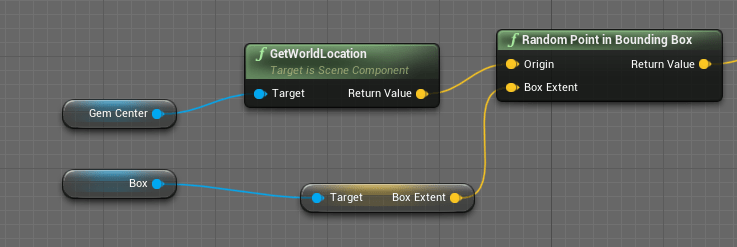 It took several rounds of testing but I got it to where I wanted it to be. Then learned about getting a random point in a box, so I used that to set the location of the gems. It looked a lot better then having them keep the same uniform positions every time they were set to rotate. I also attached a special effect to the player’s feet when they entered the boss area. Just a little detail that looks nice.