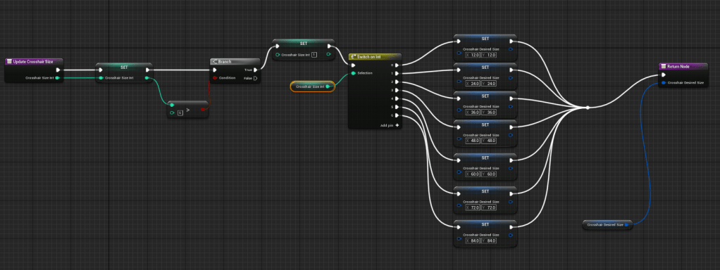 After I looked at the menus I realized I wanted to change the size of the crosshair. Instead of having only one crosshair size I added a setting so people could pick between 7 available sizes. The default is the size I prefer, and it can go really big or very tiny. I used the previous crosshair settings as a template for this new setting. Then I made sure the crosshair on the target lock-on used the same size that the player set it to.