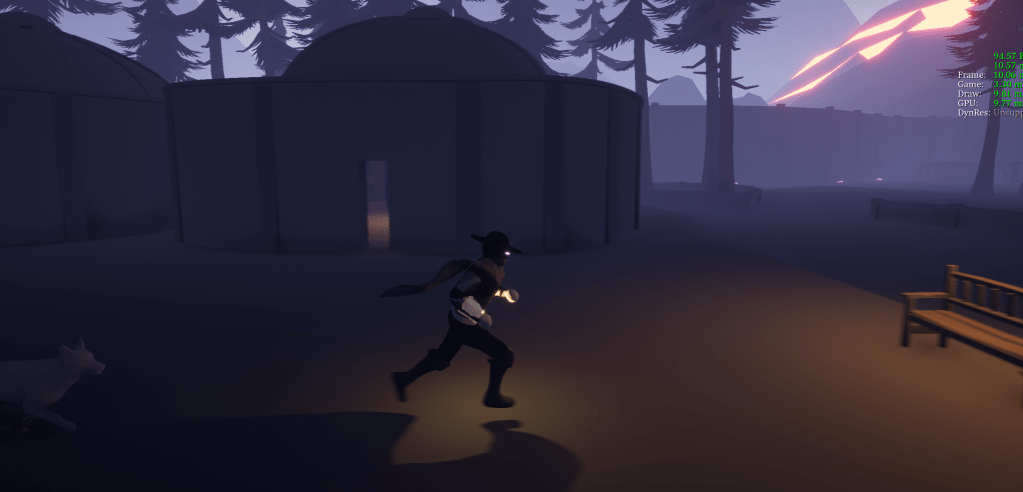 Since most of the level is done I added more scenery at the start to show the player where the character came into the area. I didn’t want it to feel like a random boxed stage which it essentially is. By adding a big door/gate the player can deduce that the character came from that tunnel. I ran around the stage testing the fps and giving the dog some exercise. As I moved around the stage I found an unintended ramp between the walls and the landscape. If the player jump and dashed into the corners with tall walls they could launch themselves high into the air. I tried my best to fix it by moving the walls and flattening the scenery. It took a while to get it in a configuration where it didn’t slide the player to heavenly heights. I probably didn’t catch all the problematic areas either. There could be other spots I don’t know about. Since I know it’s an issue I added a blocking volume around the level. At least that will keep players from falling off the stage. It isn’t a perfect solution but it is better than nothing.