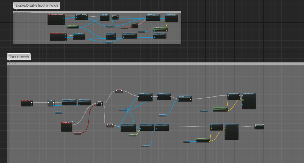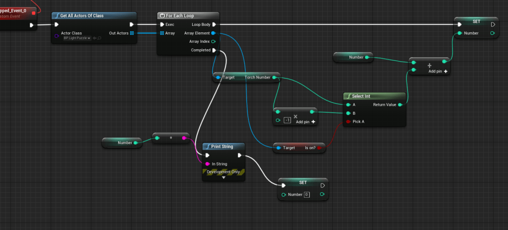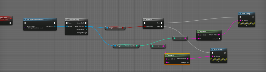 Using the blueprint of the savepoint I created new torches that can turn on and off instead of just on. This is the essential part of the puzzle. What I wanted was for the solution to be specific torches, but I couldn’t figure it out on my own. I tried different simple ways and I ended up with a solution that can be found in more than one path. That may be better. I will then have to figure out how the puzzle translates to make sense in the game.