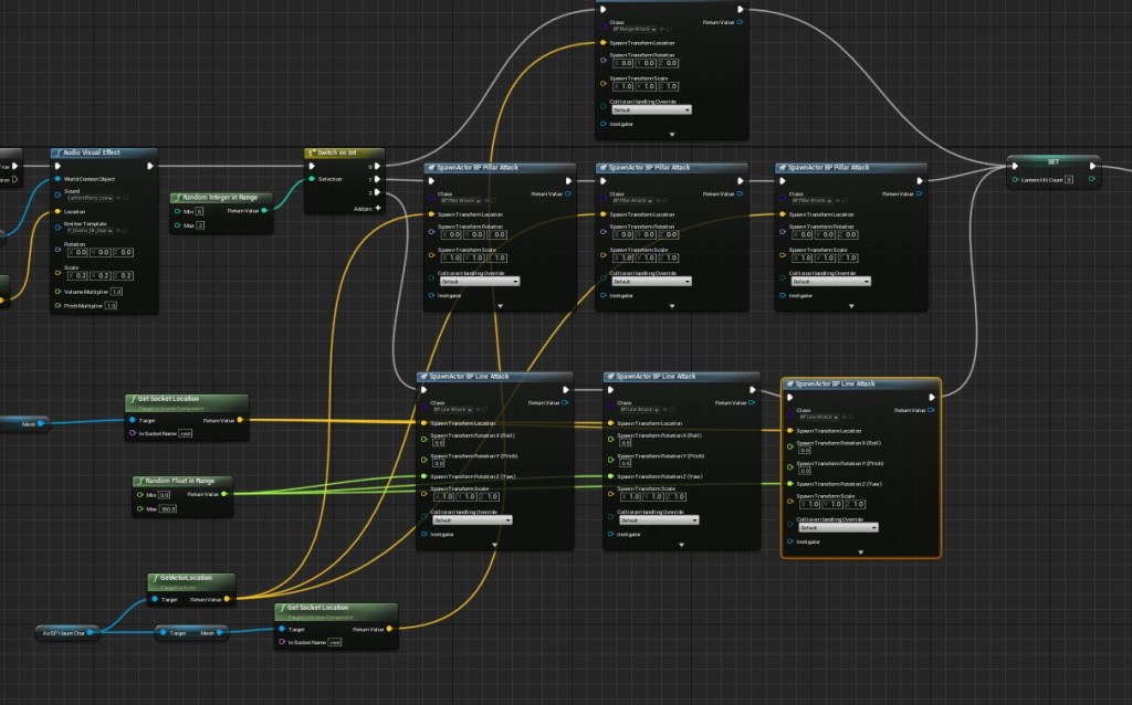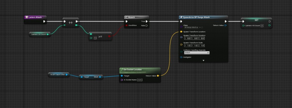 The challenge with adding attack states to the whip is that not every movement is an actual attack. I had to go back to the body animation to see what looks like motion that should deal damage. I went back and forth between both montages to make sure it was lining up properly. After I set everything right I created a custom sound cue for the attack. I gave the boss her own lantern and I made sure that the boss had a reaction to the lanterns in the arena.