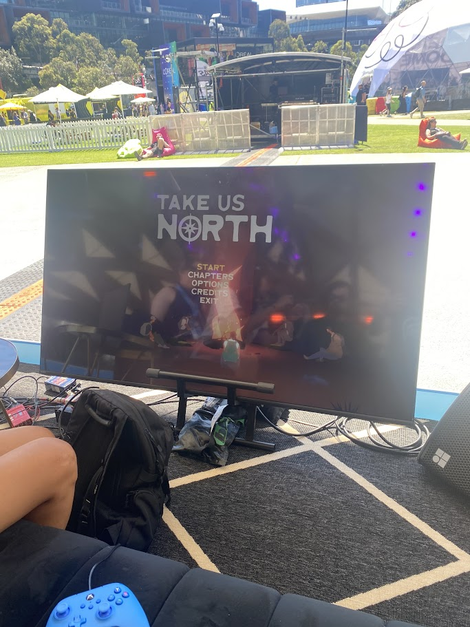 The very first game I tried while I was still jetlagged and recovering from a long plane ride was Take Us North. I saw on the schedule that it was being showcased at the park, and I thought I would try it out. The setup at the park was not what I was expecting; they had a TV and a couch to play on, and they were streaming the game on two large screens on either side of the stage. It was amazing to see a game being played on such a large LED.